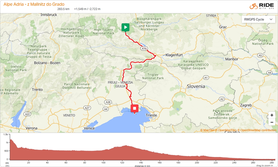 Wyruszamy z malowniczego, średniowiecznego Salzburga przez łagodne wzgórza austriackich Alp mijając krystalicznie czyste jeziora i urokliwe górskie wioski. Po austriackiej stronie mijamy idylliczną dolinę Salzach, znane z zimowych konkursów skoków narciarskich Bischofshofen, wiszące na skałach uzdrowisko Bad Gastein oraz imponujący krajobraz wysokogórski Wysokich Taurów i wjeżdżamy w bujny, zielony krajobraz równin alpejskich regionów austriackiej Karynti i włoskiej Friuli oferujący prawdziwy kontrast z alpejską scenerią z początku trasy. Za malowniczym Villach przekroczymy austriacko-włoską granicę i skrajem Alp Julijskich, po ścieżkach rowerowych świetnie zrobionych na miejscu dawnych linii kolejowych i w coraz bardziej śródziemnomorskiej atmosferze przejedziemy przez wpisane na listę Unesco Palmanovę i Akwileję i dojedziemy do Grado, nad ciepłe wody Adriatyku.