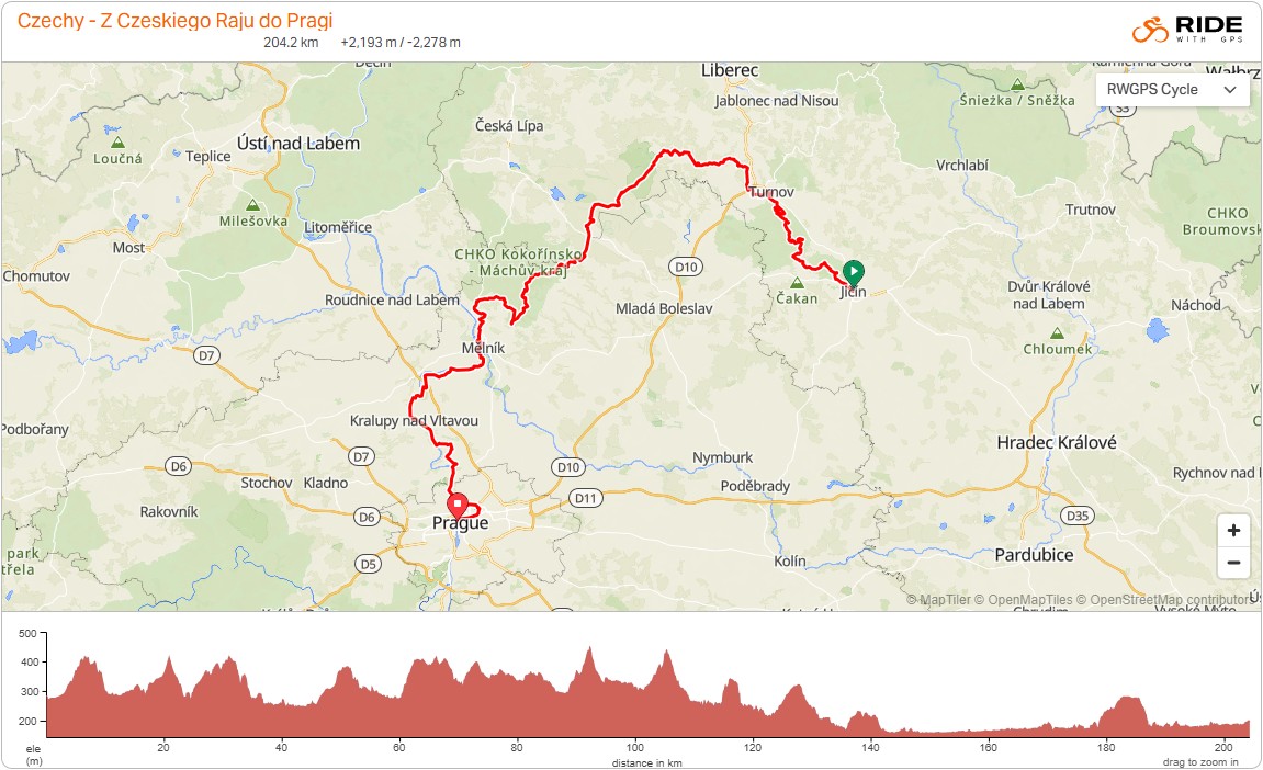 Wyprawę The Best of Czechy rozpoczniemy w znanym z kreskówek o Rumcajsie kolorowym Jiczynie. Pierwszy dzień na rowerach to przejazd przez Czeski Raj, jedno z najpiękniejszych miejsc w całych Czechach. Tam na ponad 40 km trasie biegnącej przez sam środek Czeskiego Raju czekają na nas skalne miasta, zamki, głębokie lasy, wąwozy i znakomite punkty widokowe. Kolejne kilometry będą biegły do Kokorinska – lesistej enklawy z malowniczymi dolinami, jaskiniami, formami skalnymi i wyrastającym ponad wierzchołkami drzew okazałym zamczyskiem. Za Kokorinskiem otoczony winnicami historyczny Melnik - czeskie centrum winiarskie, skąd płaskim odcinkiem wzdłuż Wełtawy jedną z ulubionych przez czeskich rowerzystów tras rowerowych dojedziemy do Pragi, jednego z najpiękniejszych miast Europy. Ostatni dzień na rowerach to 60 km trasa, na której poznamy dwie urokliwe czeskie krainy - Krivoklatsko, lesisty rezerwat doliny rzeki Berounki, która od tysiącleci przechodzi tutaj przez głęboką dolinę tworząc spektakularne kaniony i meandry oraz Czeski Kras z wapiennymi skałami i jaskiniami oraz gotyckim zamkiem Karlstejn – najsłynniejszym z czeskich zamków, położonym w bajkowej, pagórkowatej, ulubionej przez prażan okolicy. Z zamku Karlstejn powrócimy do Pragi i tam kolacją na praskiej starówce zakończymy tygodniową wyprawę po Czechach.