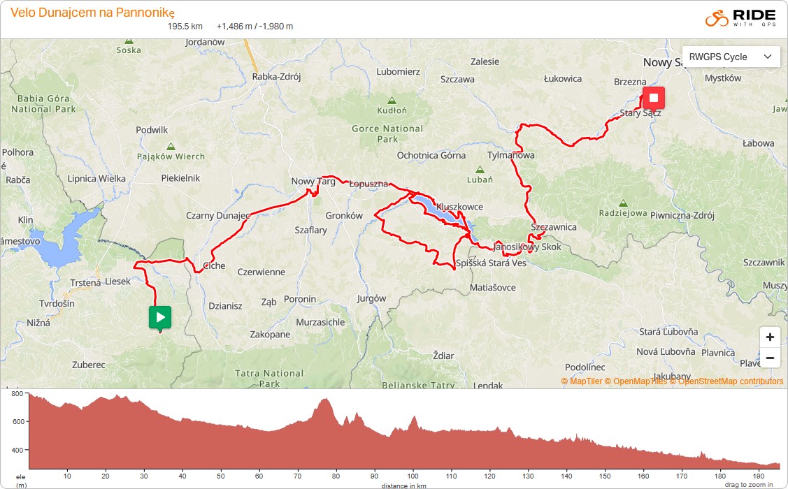 W Czerwonym Klasztorze wjedziemy na słynną Drogę Pienińską. Stamtąd czeka nas 10 km odcinek zapierających dech w piersiach krajobrazów w wąwozie Dunajca pomiędzy dochodzącymi do 300 metrów pionowymi, skalnymi ścianami. Zostawiając za sobą po lewej kolejny słynny szczyt Pienin – Sokolicę dojeżdżamy do Szczawnicy, popularnego uzdrowiska, gdzie kończy się przełom rzeki. Ze Szczawnicy ścieżką wzdłuż Dunajca dojedziemy najpierw do Krościenka, kolejnego znanego uzdrowiska z ładną zabudową, a później w region Beskidu Sądeckiego do otoczonego sadami owocowymi Łącka. Koniec wycieczki to sielankowe okolice Łącka i wygodna ścieżka rowerowa Velo Dunajec, która zaprowadzi nas do położonego w widłach Dunajca i Popradu Starego Sącza z ładnym, brukowanym rynkiem i zabytkowymi kamienicami. W Starym Sączu żegnamy się z trasą wzdłuż Dunajca i stamtąd krótki, niespełna 5 km odcinek wzdłuż Popradu zaprowadzi nas do położonej malowniczo w jego dolinie wioski Myślec, gdzie wieczór i kolejne dni spędzimy na Festiwalu Pannonica!